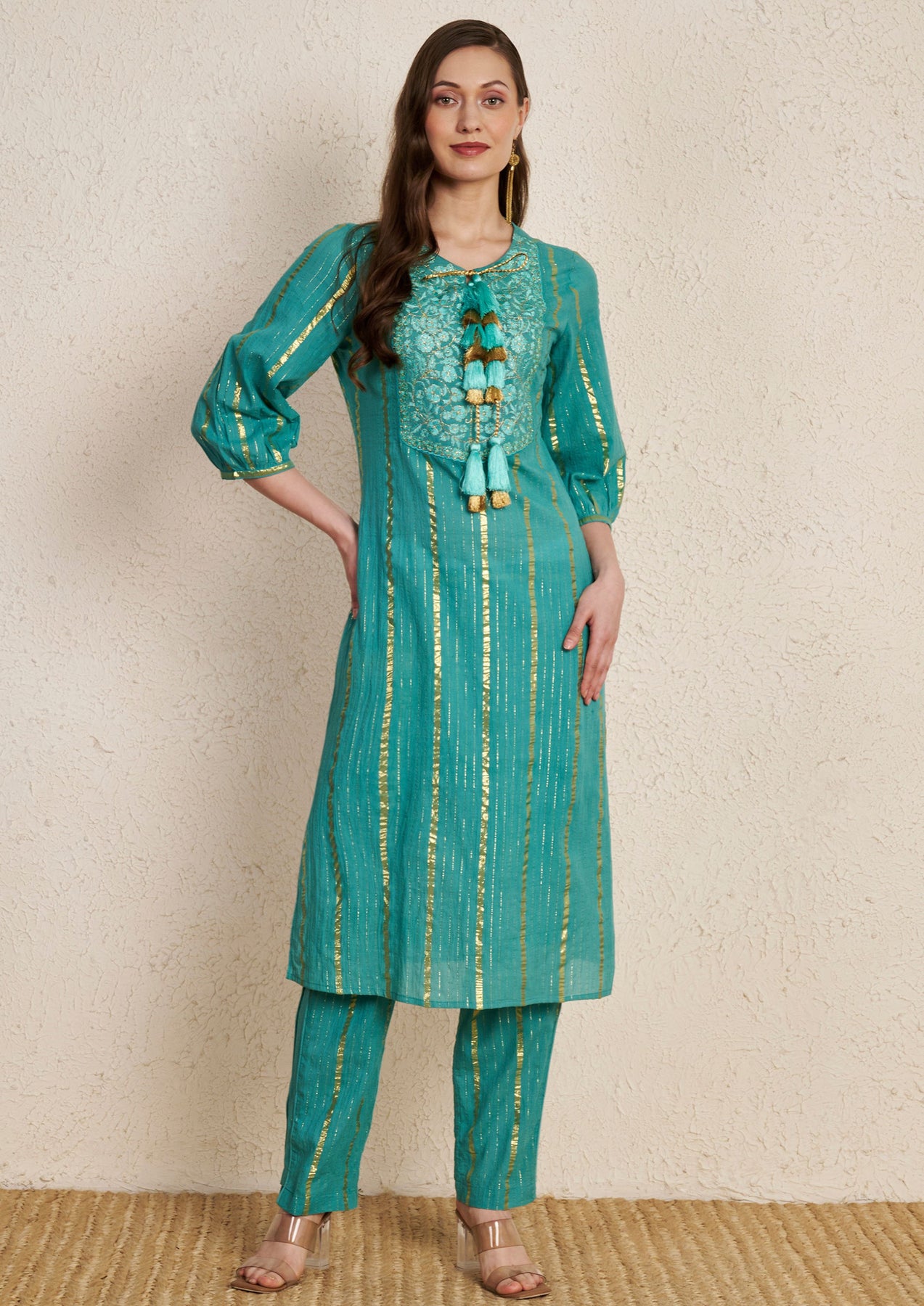 Add a refreshing touch to your wardrobe with this teal cotton kurta for women, thoughtfully designed for the summer season. Accented with subtle golden stripes and finished with delicate embroidered details, it brings a refined yet easygoing charm to your look.