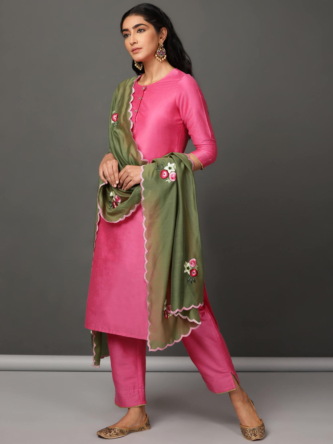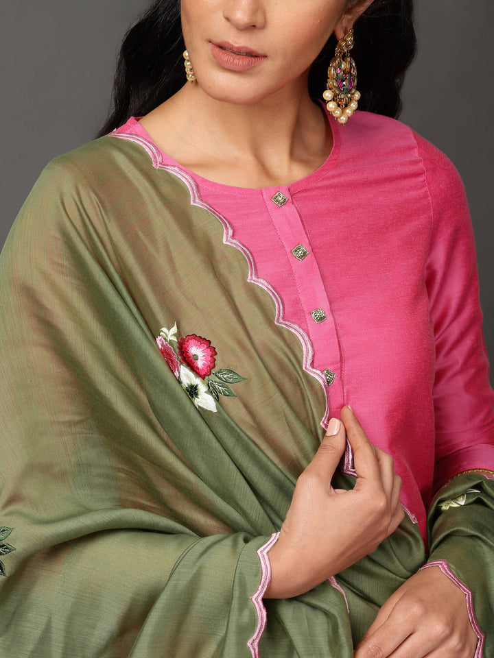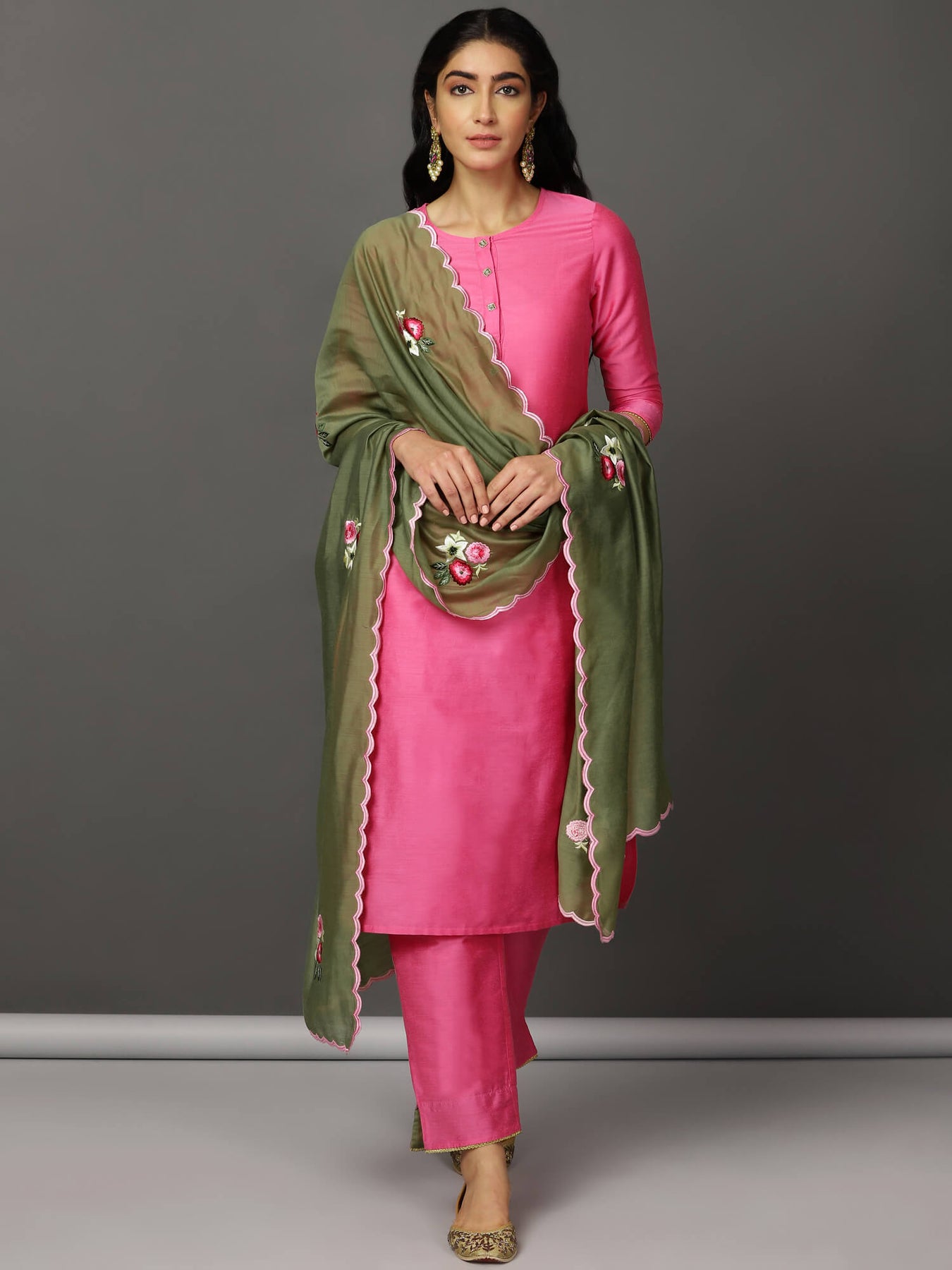 Pink Art Silk Kurta with pants and Olive Chanderi dupatta.