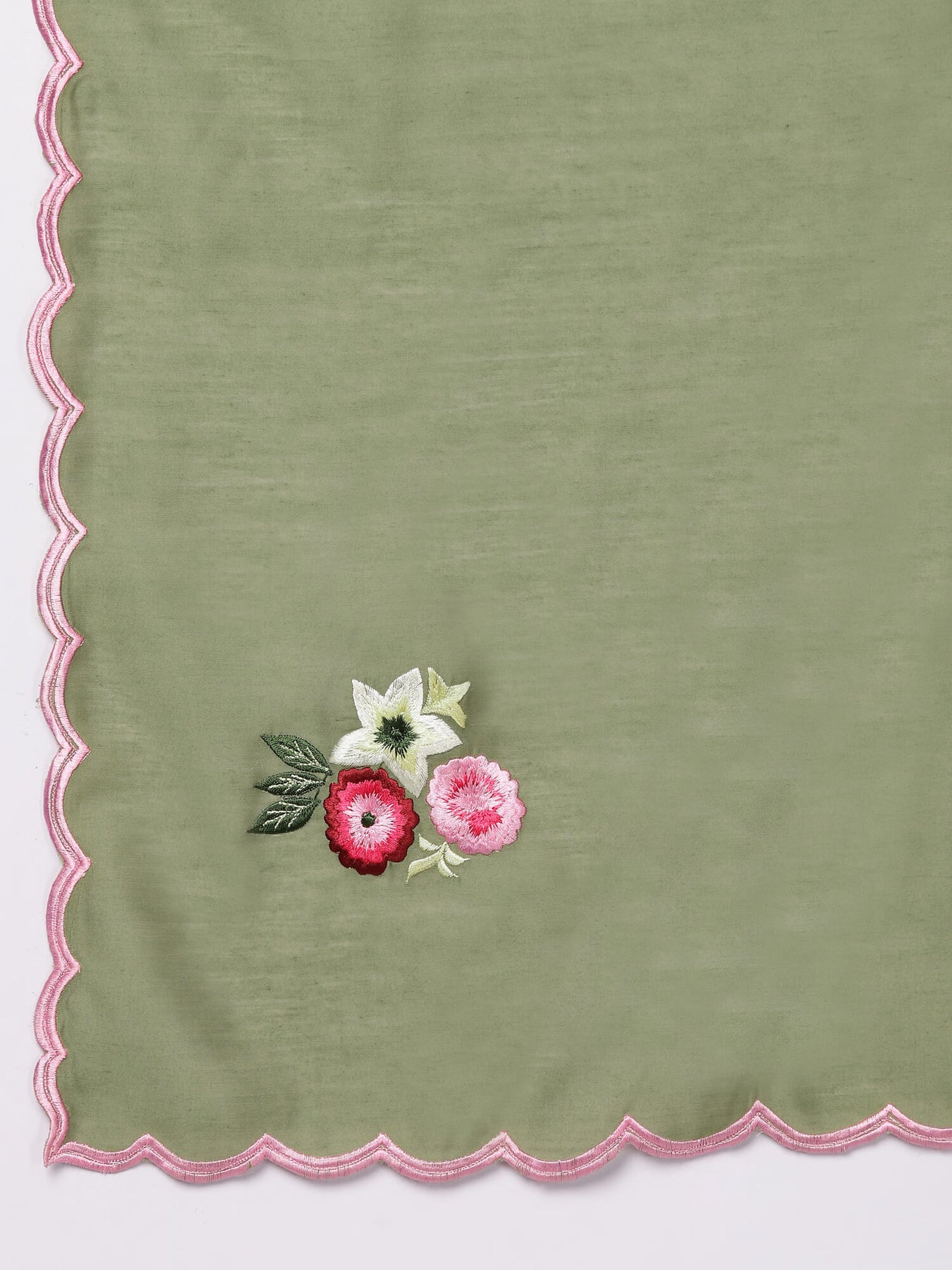 Make a stunning style statement with this elegant pink kurta set from Nuhh. This set comes with a contrasting olive dupatta scalloped on all four sides with embroidery and bunches of flowers embroidered all over. A perfect pick to don for a wedding event and festivities, style this set with a pair of embellished juttis, statement accessories and a chic potli bag to complete the ensemble.